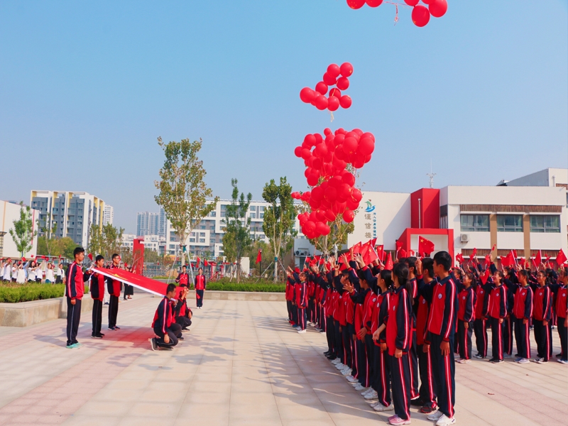 《歌唱祖国》的旋律响起,杨菊同学歌声飞扬,用饱满的深情祝愿祖国繁荣富强。此时,广场上空,满载祈愿的红气球进入了我们的视线与湛蓝的天空相互映衬,同学们不禁摇动着手中的红旗欢呼起来。《我和我的祖国》在广场上空回旋,突然一面五星红旗在人群中涌动,像海上的波浪,映着蓝天,闪闪发光。学生代表手擎承载祝福与梦想的五星红旗,那是孩子们在用飞奔而坚毅的步伐为伟大的祖国欢呼庆祝。就在此刻,鲜艳的五星红旗迎风飞扬,全体师生与国旗同框,为奋进的祖国祝福永年流长。