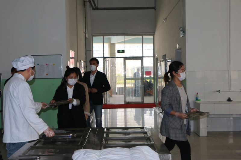 模拟演练按照学生一日生活制度,分六个场景模拟演练了学生开学后,疫情防控的具体措施和突发状况的处置。在大门口师生按照防控规范前后间隔1米的距离,有序进行体温测量和登记后进入校园。现场模拟了发现体温异常学生后,医务人员将其带往隔离点临时隔离、登记复测、班主任第一时间联系家长带回处置、隔离场所消杀的全过程。在按照防控标准调整学生间距后的教室中,进行了晨(午)检体温测试、体温异常学生发现与处置、现场消杀与学生组织、教室常规消毒等流程,学生单人单桌间隔就座,模拟过程规范流畅。在学生饮水设施管理场景中,值班教师详细展现了饮水机表面清理及规范接水等程序,切实保障师生饮水健康。卫生间墙面上醒目张贴着“七步洗手法”的具体步骤,洗手台按规范放置了肥皂、消毒洗手液、纸巾等洗消物品,确保开学后重点区域的卫生防护工作,一名学生现场展现了“内外夹弓大立腕”洗手场景。模拟餐厅师生就餐场景中,教师间隔1米距离有序排队先行测温,经过消毒毯后进入就餐场所,持个人餐具间隔1米排队领餐后,保持单向、一人一桌安静就餐,餐厅消杀规范,门窗气流通畅。