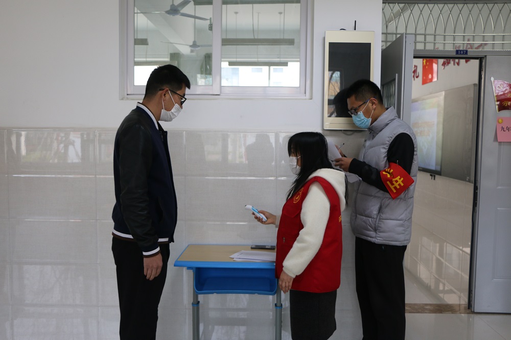 此次演练包括体温检测、列队入校、课堂突发状况、课间入厕接水、食堂就餐等演练项目。演练现场,三十余位教师化妆成返校学生,带好口罩,在校门口按间隔一米距离列队,依次进入安全检查通道,经红外线测温仪测试体温正常后进入学校。为使学生单人单桌以保持安全距离上课,我校将九年级学生由两个班级编排成三个,在模拟现场,不同班级的“学生”按照每个班级固定的入口进入教学楼。在班级上课活动演练中,实际演练了学生突发高烧、呕吐等紧急情况的模拟应急处置。整个演练过程,老师们组织到位,保障有力,有条不紊,达到了预期效果。