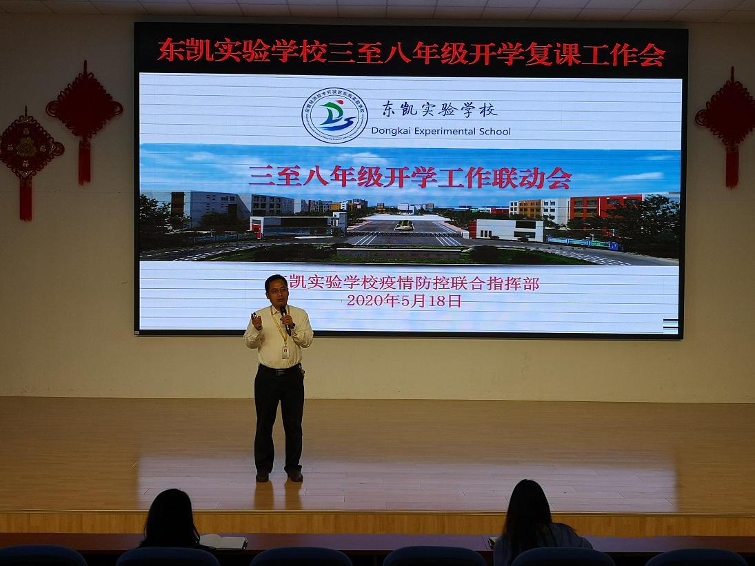 为保障三至八年级学生开学复课工作有序开展,5月18日上午,东凯实验学校分学段开学复课工作会在敏行楼四楼报告厅召开。会议由学校党支部书记、校长赵文刚主讲,开发区开学复课驻校工作组成员、学校疫情防控专班成员、三至八年级全体教师及后勤保障人员参加会议。