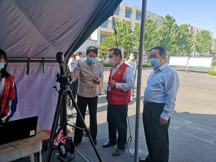 刘市长一行详细了解了我校初中部开学情况,实地察看了入校体温检测通道、隔离观察室等地,就学生返校流程、疫情突发处理、学生心理辅导等返校重点问题进行详细询问。
