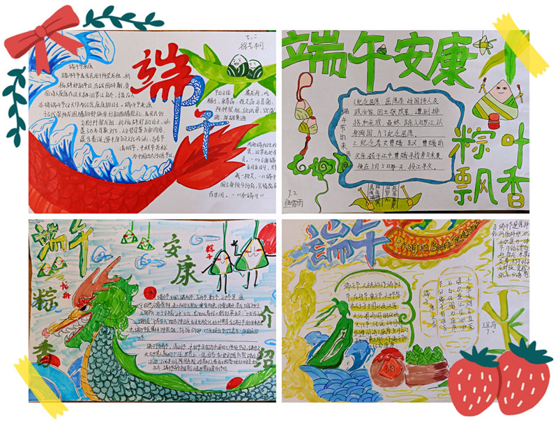 六年级组织了画报展,七年级组织了端午手抄报制作,八年级组织了端午征文。