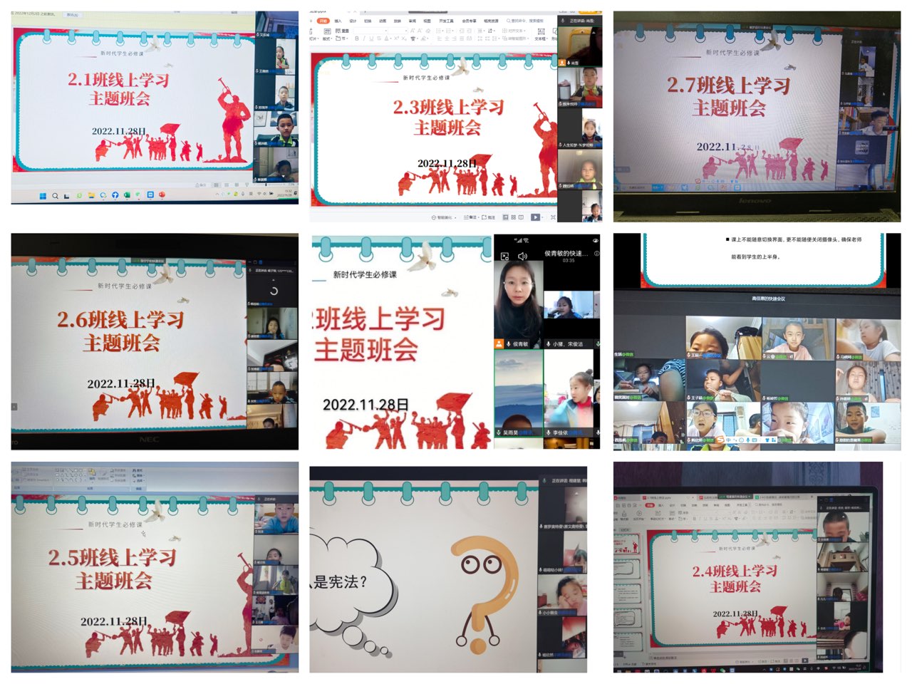 首先,各班主任老师对同学们近几天的线上学习情况进行了总结。接着,班主任们组织学生讨论对于近期疫情与线上教学的想法与感受,引导学生正确对待情绪的变化。最后,在第九个国家宪法日来临之际,各班以不同形式进行了“弘扬宪法精神,厚植爱国主义情怀”的主题班会活动。