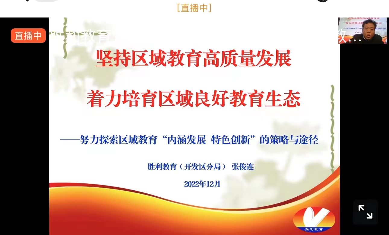 12月20日上午,胜利教育管理服务中心组织召开了2022-2023学年第一学期教学工作点评反馈会。教管中心张俊连主任作了“坚持区域教育高质量发展 着力培育区域良好教育生态”的主题报告。我校赵文刚校长、宋团辉副校长、以及相关部室主任和组长参加了此次视频会议。