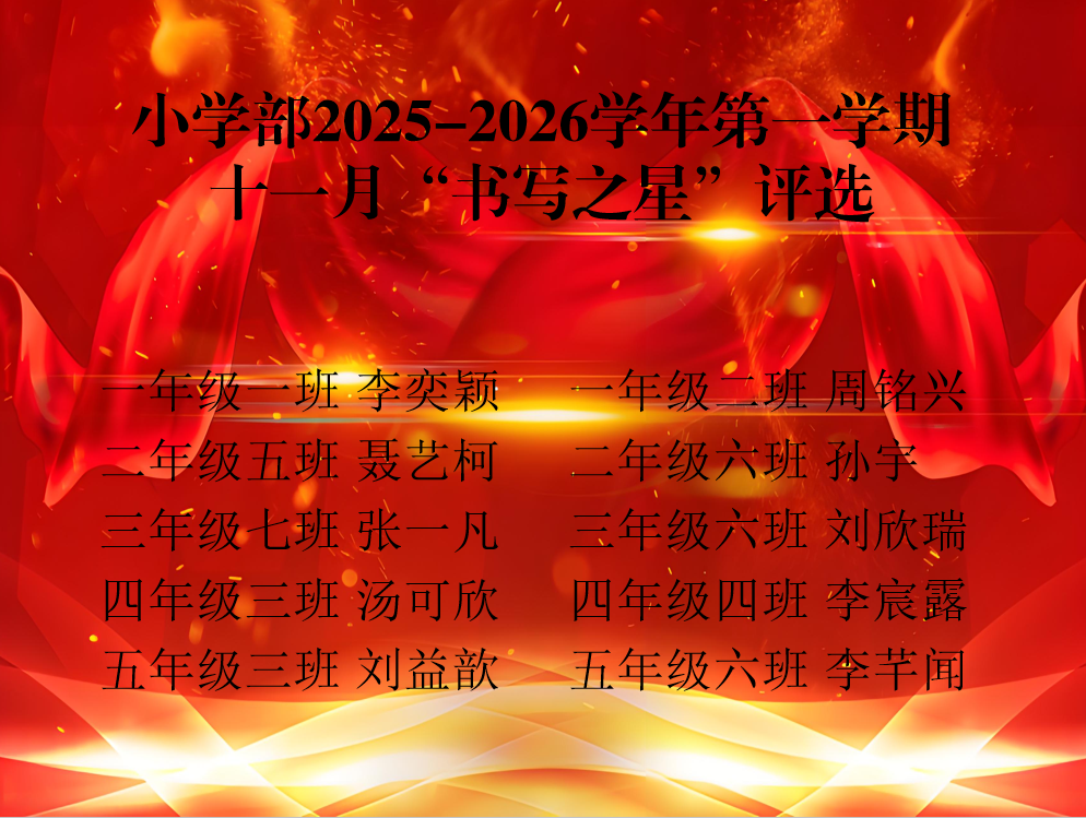 东凯实验学校小学部“书写之星”“阅读之星”十一月评选落下帷幕,一批在汉字书写与阅读中表现优异的学子登上校园红榜。评选活动以每月常态化形式推进,通过分层评选培养学生每日阅读习惯,增强学生发展逻辑思维与文化积累能力,同步激发学生读写兴趣,营造“月月练书写、月月读好书、人人争明星”的校园氛围,助力语文核心素养稳步提升。