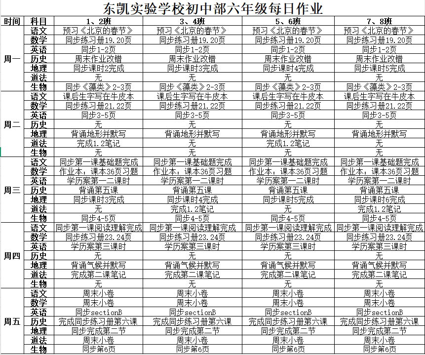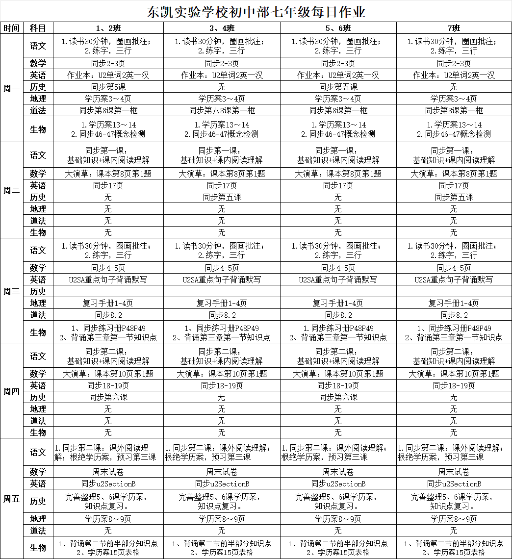 东凯实验学校初中部6-7年级第2周作业单