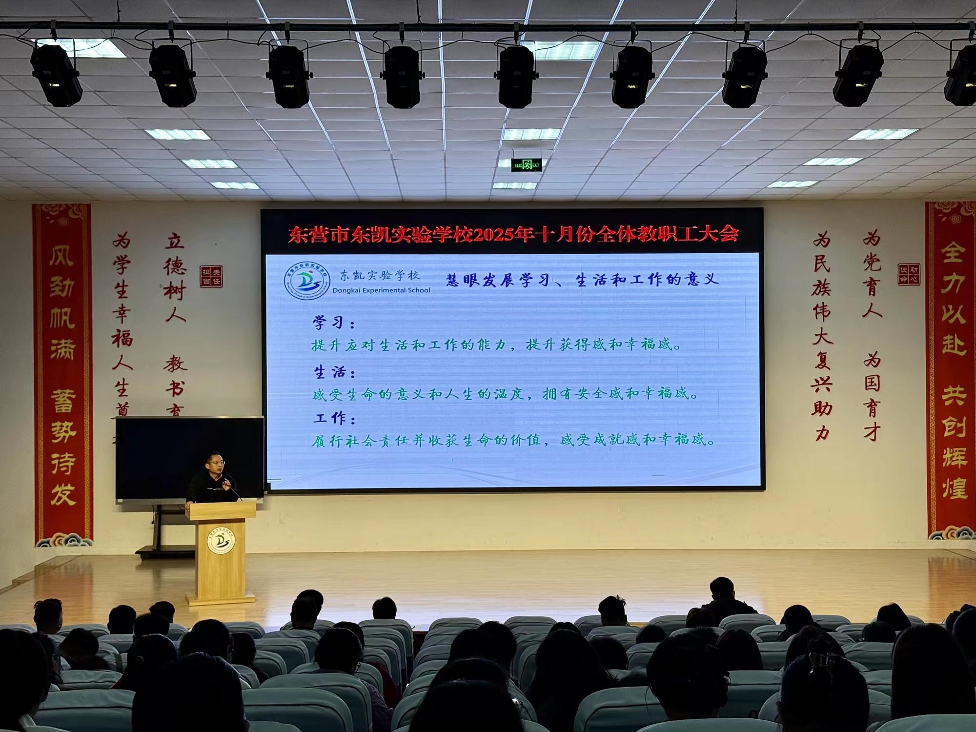 10月24日,学校召开十月份全体教职工大会。赵文刚校长围绕近期重点工作进行部署,强调要聚焦“义务教育学校办学质量评估”“山东省第十届小学校长大会”及“建校10周年素质教育办学成果博览会”三项任务,以项目化推进为抓手,统一思想,凝聚力量,全力推进幸福家园建设,为学校高质量发展注入新动能。