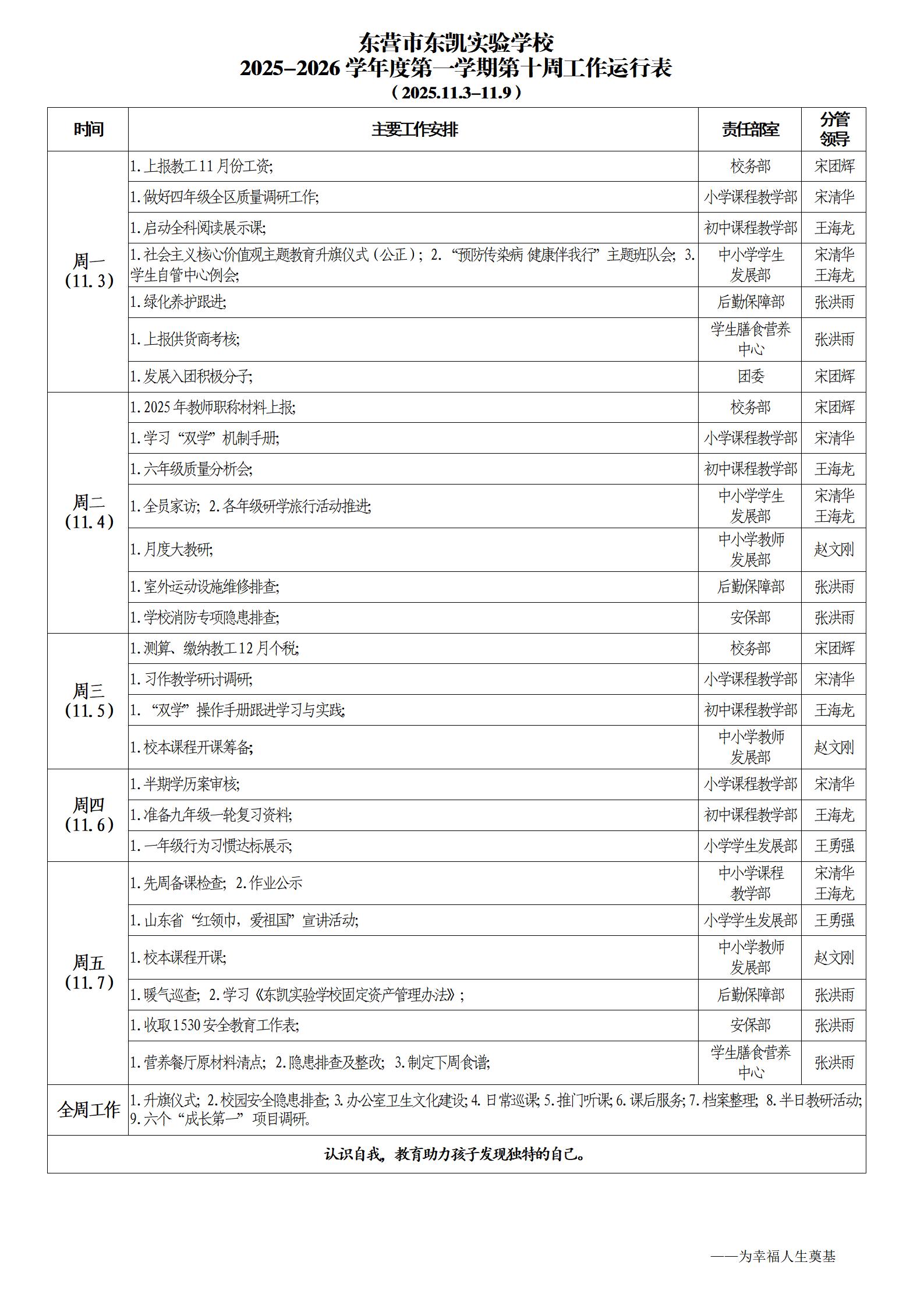 东营市东凯实验学校2025-2026学年第一学期第十一周工作运行表