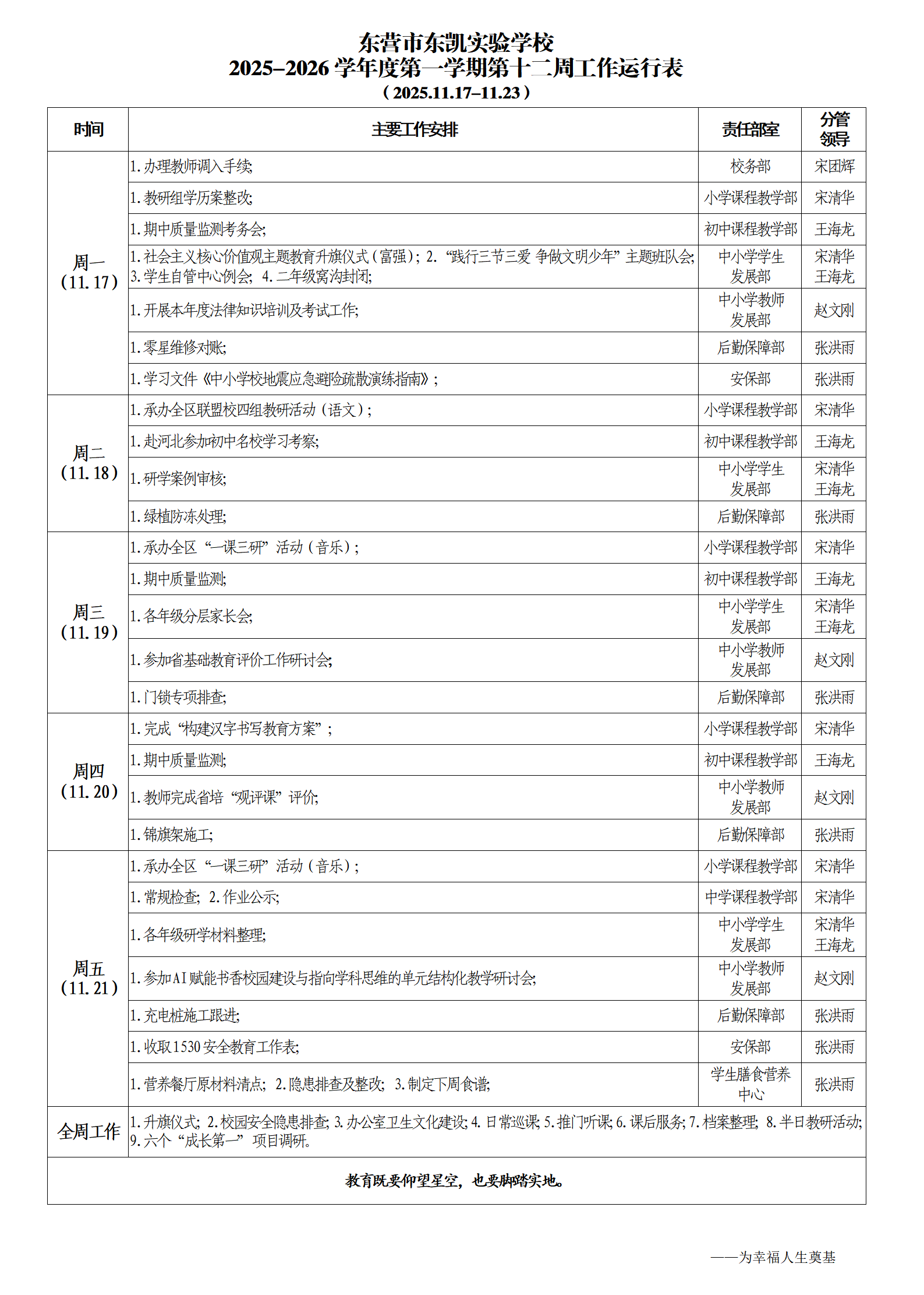 东营市东凯实验学校2025-2026学年第一学期第十一周工作运行表