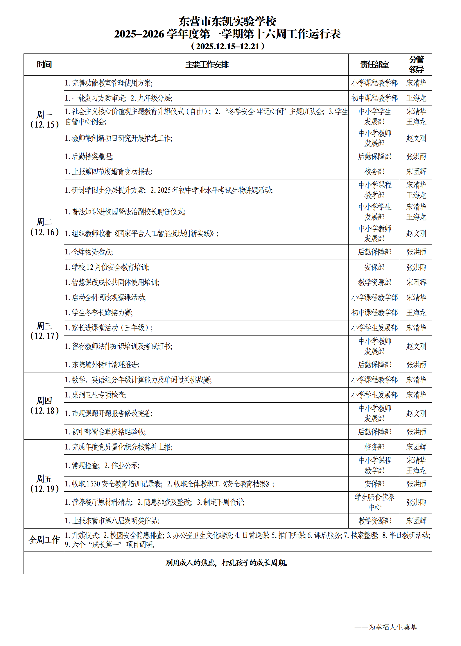 东营市东凯实验学校2025-2026学年第一学期第十五周工作运行表