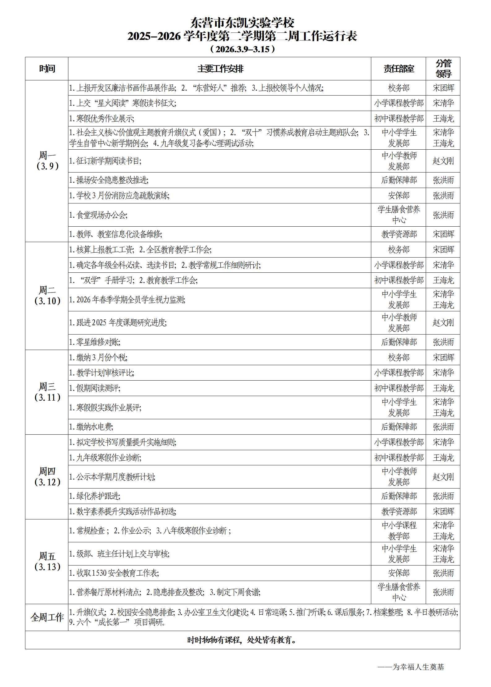 东营市东凯实验学校2025-2026学年第二学期第二周工作运行表