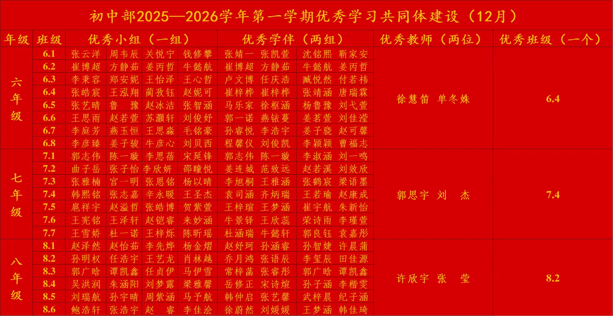本周,初中部开展12月份优秀学习共同体评选活动。在六至八年级共评选出优秀学习共同体建设班级3个,优秀合作小组21组,优秀学伴42对,优秀教师6名。学校将进一步加强学习共同体运行机制建设,持续丰富“学为中心”课堂建设内涵,促进学校教育教学高质量发展。