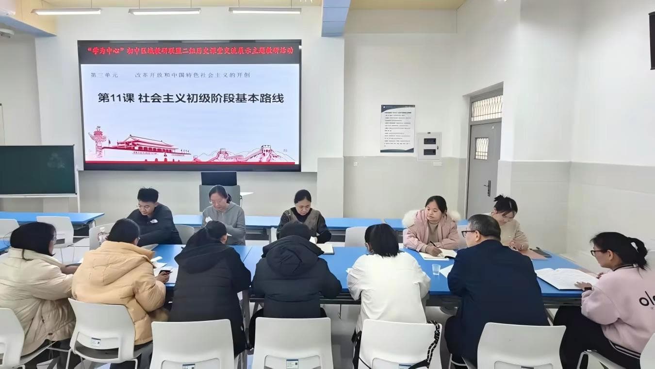 3月31日,“学为中心”初中区域教研联盟二组历史课堂交流展示活动在我校举行。活动以“落实‘学为中心’理念深耕新教材新授课”为主题,围绕《社会主义初级阶段基本路线》开展同课异构。我校王婷婷老师与联盟内其他两位教师依次执教,各展教学巧思。教研室历史教研员贾爱青老师结合课堂设计、教学实施等方面进行专业点评,精准指出亮点与改进方向,为教师优化教学提供了具体指导。